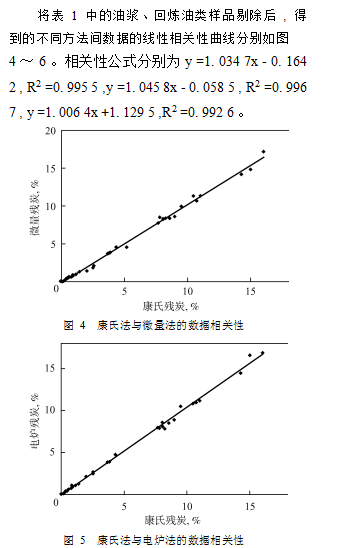 前述的實(shí)驗(yàn)結(jié)果說明 ,用三種不同方法測(cè)定不同類型的油樣時(shí) ,所得殘?zhí)繑?shù)據(jù)間的相關(guān)性有好有