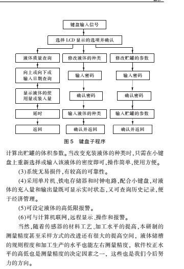 [9-11]。 LCD 可直接顯示液體的種類、質量和液面高度。 貯罐規(guī)格改變時,輸入其內徑和高度便可得到其體積參數(shù)。 液體種類改變時,只需在鍵盤上重
